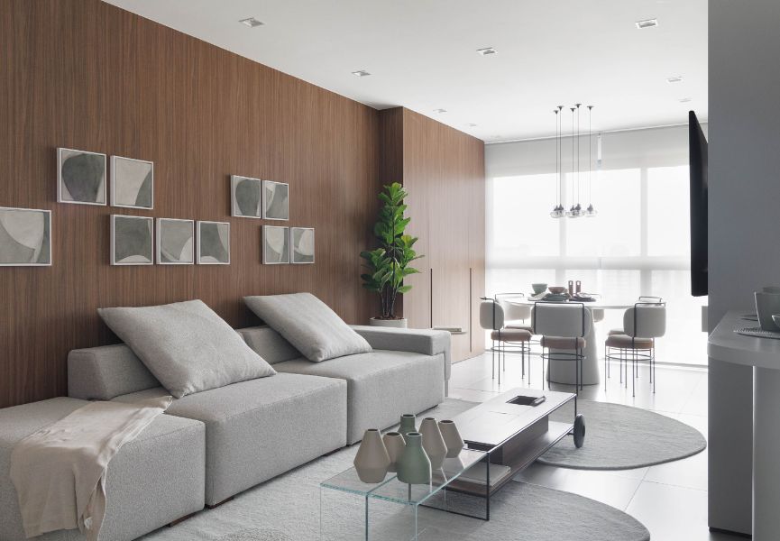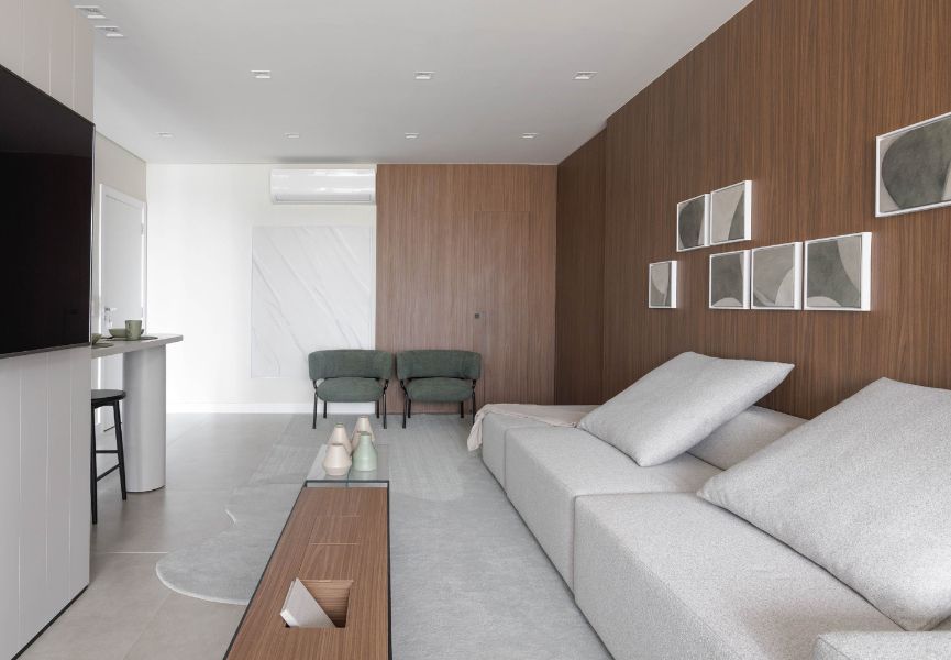 No apartamento pronto para morar, a base neutra, presente no piso, nos estofados e nos tecidos, cria um pano de fundo calmo e contínuo, ampliando a sensação de espaço e fluidez. A madeira em tom escuro, aplicada de forma precisa na marcenaria, surge como elemento de identidade e aconchego.