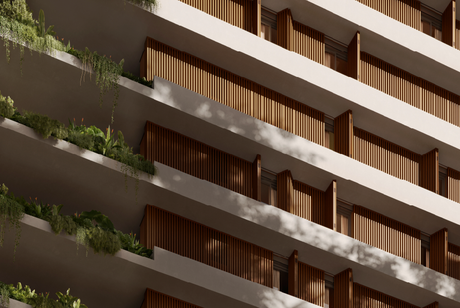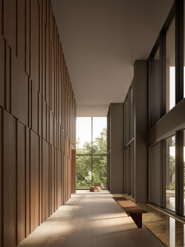 As varandas amplas contornam a esquina, abrigando floreiras integradas ao paisagismo, que introduzem o verde na vida cotidiana. No térreo, um jardim exuberante conduz ao interior do empreendimento, enquanto o pé-direito triplo reforça a imponência e cria um ponto de contemplação. Duas marquises com vegetação ascendente estabelecem a relação entre o espaço público e o privado, integrando o prédio à escala do bairro.