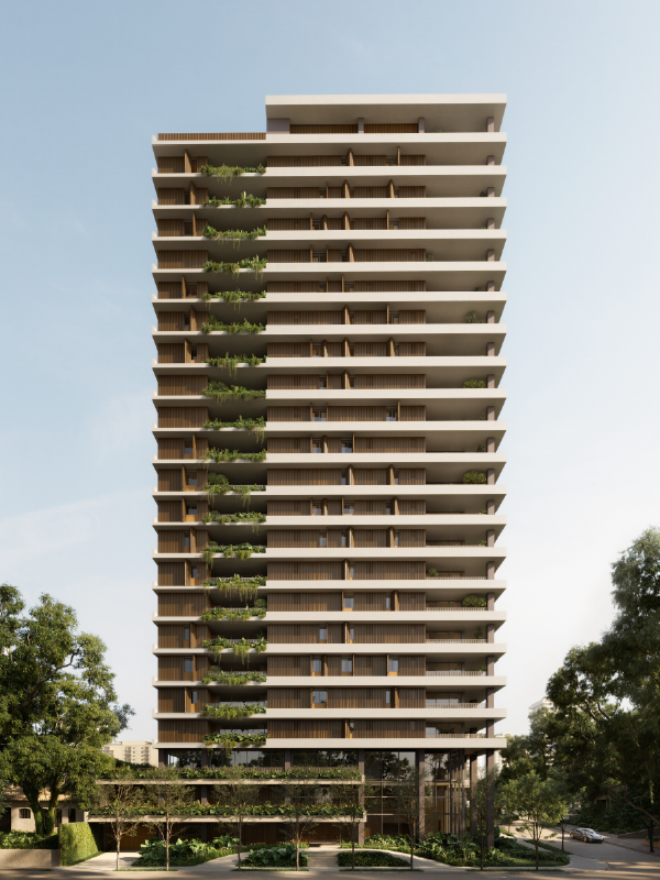 O paisagismo assinado por Tellini Vontobel reforça o vínculo entre o edifício e o entorno. Inspirado na tradição das antigas floreiras da rua Belo Horizonte, o projeto revisita essa memória com linguagem contemporânea, em varandas que se tornam jardins suspensos. Ao final, cada morador ganha o seu próprio recorte da paisagem.