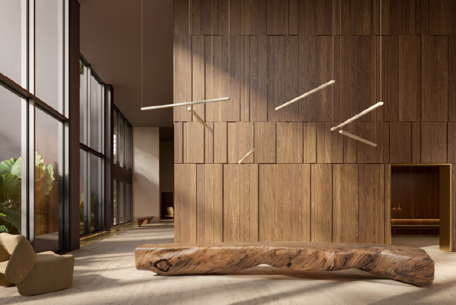 O pé direito triplo pedia um acesso de altíssimo padrão. Por isso, no hall social, um painel de nogueira conversa com os brises da fachada e uma iluminação flutuante se transforma em escultura. O conjunto, visível de fora, vai impactar também quem passa pelo edifício. “Nada é apenas decorativo. Cada material, cor e proporção foi pensada para despertar uma sensação”, explicou o arquiteto durante o evento.