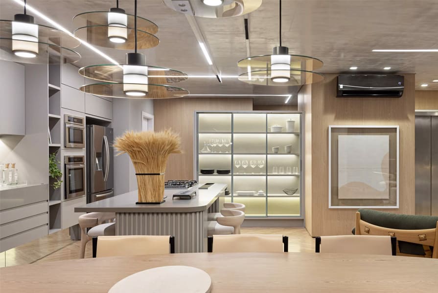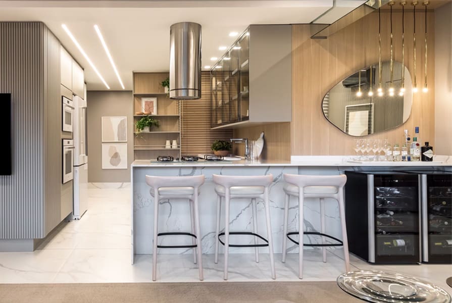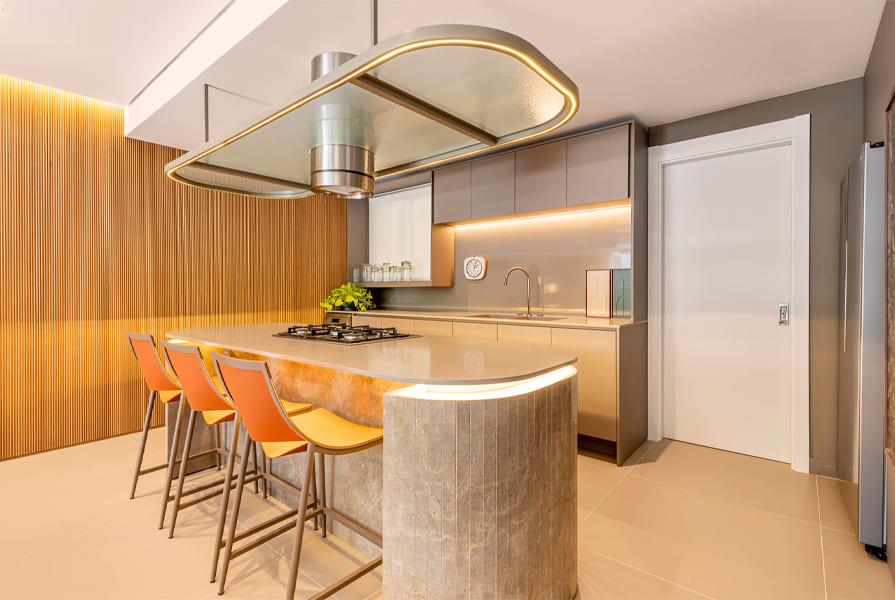 O conceito de “cozinha de estar” associado com essa bancada vem da ideia da cozinha gourmet, um espaço perfeito para cozinhar e confraternizar.