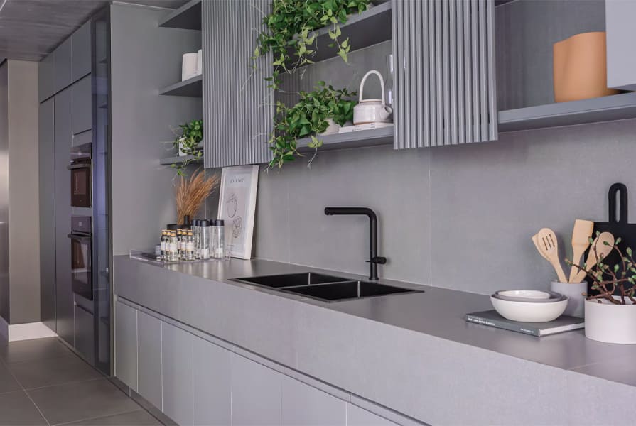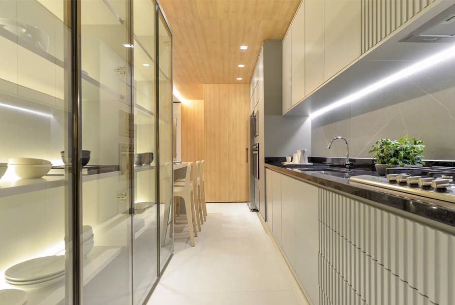 Uma cozinha linear é um tipo de layout organizacional onde todos os elementos principais, como pia, fogão, geladeira e armários, estão dispostos em uma única linha ao longo de uma parede. É a forma mais encontrada e mantém o ambiente mais amplo na cozinha quando seu espaço disponível é menor.