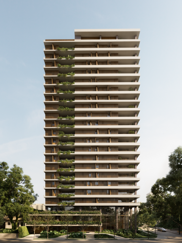 O paisagismo de Tellini Vontobel aprofunda o vínculo entre o edifício e seu entorno. Inspirado na tradição das antigas floreiras da rua Belo Horizonte, o projeto revisita essa memória com linguagem contemporânea, transformando as varandas em jardins suspensos. Assim, cada morador passa a ter o seu próprio recorte da paisagem.