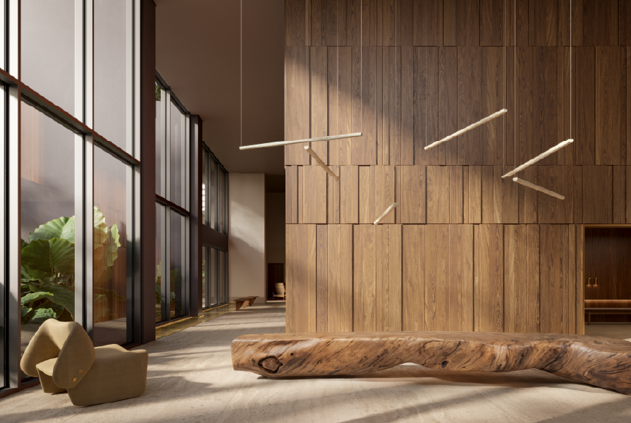 Os interiores de Nildo José se comunicam com a linguagem do projeto arquitetônico ao proporem jardins e espelho d’água que criam uma transição suave entre a rua e o interior do edifício, conduzindo a um hall de pé-direito triplo que reforça o caráter exclusivo do empreendimento. Nas áreas de lazer, a atmosfera inspirada na hotelaria de alto padrão ganha interpretação própria, com identidade brasileira e curadoria de design assinada pelo arquiteto.
