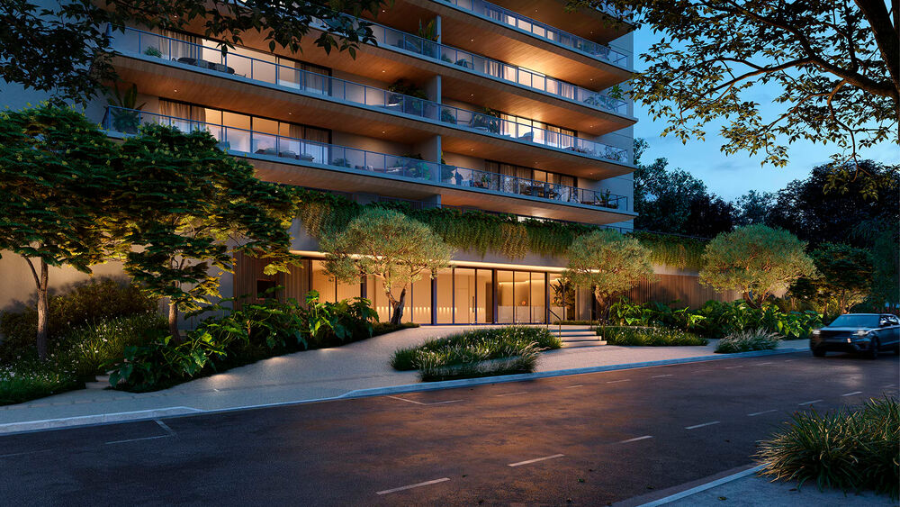 Presente no design de interiores, a madeira é realçada por uma luz suave como um véu, enquanto pontos de destaque, como a iluminação uplight na vegetação, trazem dinamismo e vitalidade ao ambiente, conforme descrição da Apollo Iluminação.