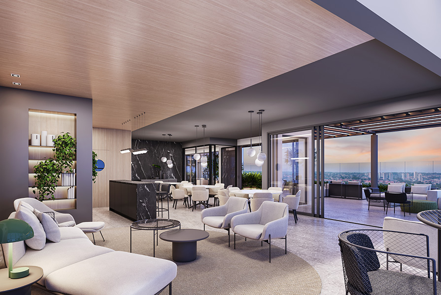 “É um produto pensado para quem valoriza praticidade, mas não abre mão de qualidade e valor agregado”, explica Marcelo. Entre os diferenciais estão o rooftop com academia, o salão de festas com vista panorâmica e espaços de convivência que reforçam a proposta de viver conectado a uma ampla rede de serviços.