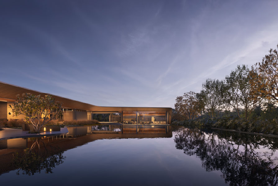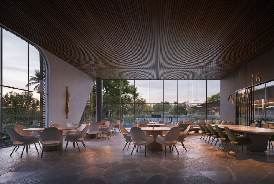 Os diferenciais em relação a outras propostas também partem da arquitetura. Os ambientes são organizados em torno da Praça das Águas, elemento central formado por um espelho d’água integrado a uma piscina com borda infinita. O projeto foi pensado para abraçar essa lâmina d’água, com grandes aberturas que enquadram a paisagem a partir de qualquer ponto do clube.
