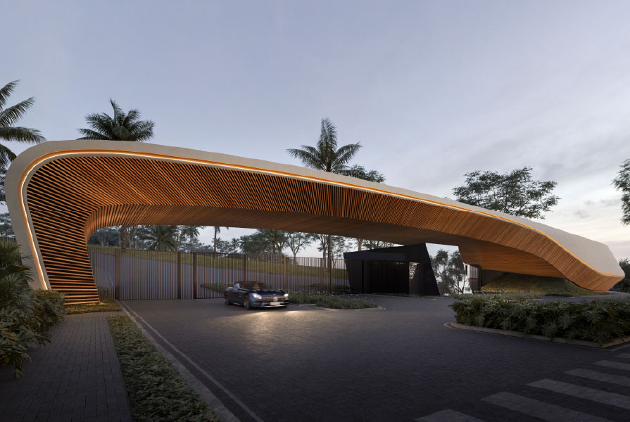 Linhas sinuosas presentes no design das portarias, assinadas pela Castro Arquitetos. Divulgação: Plaenge