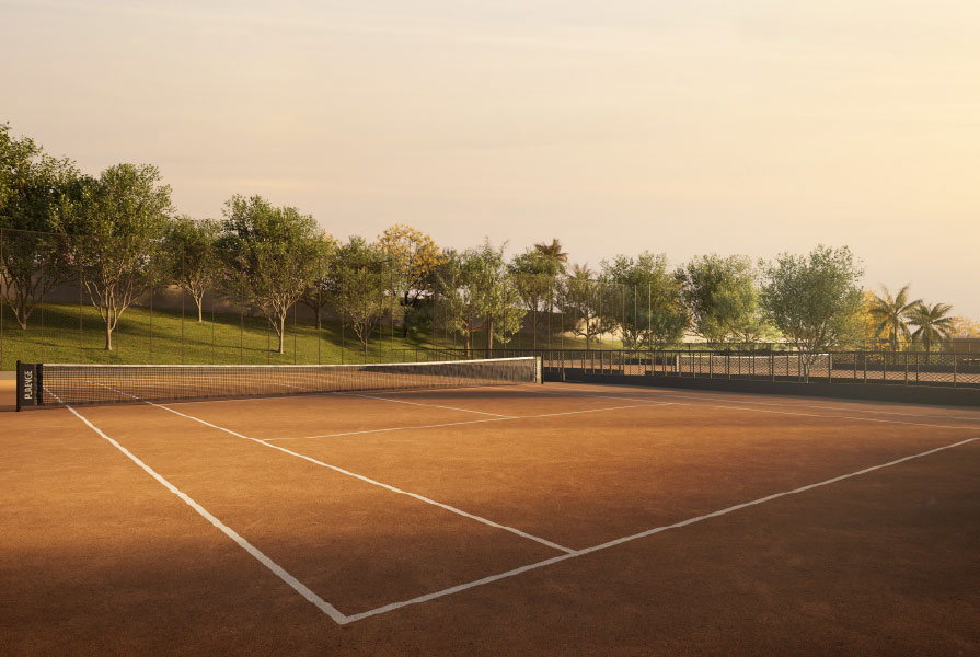 Ao redor desse núcleo, os espaços se distribuem de forma contínua: academia de alta performance, estúdio fitness, pilates, sauna, sala de massagem, Drink Lounge e Espaço Gourmet. O conjunto se completa com um complexo de quadras de tênis, pensado para o uso cotidiano. Cada condomínio conta ainda com áreas próprias de convivência e descanso — ateliê, academias ao ar livre, praças, playground, pistas de caminhada e refúgios de meditação — que ampliam a vivência do clube no dia a dia.