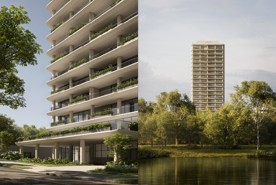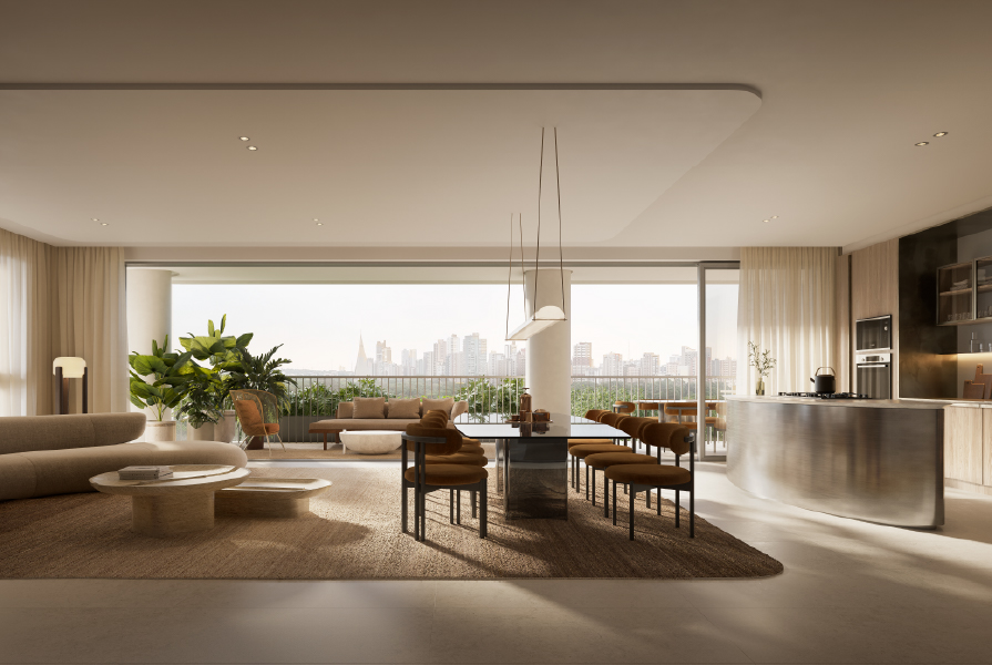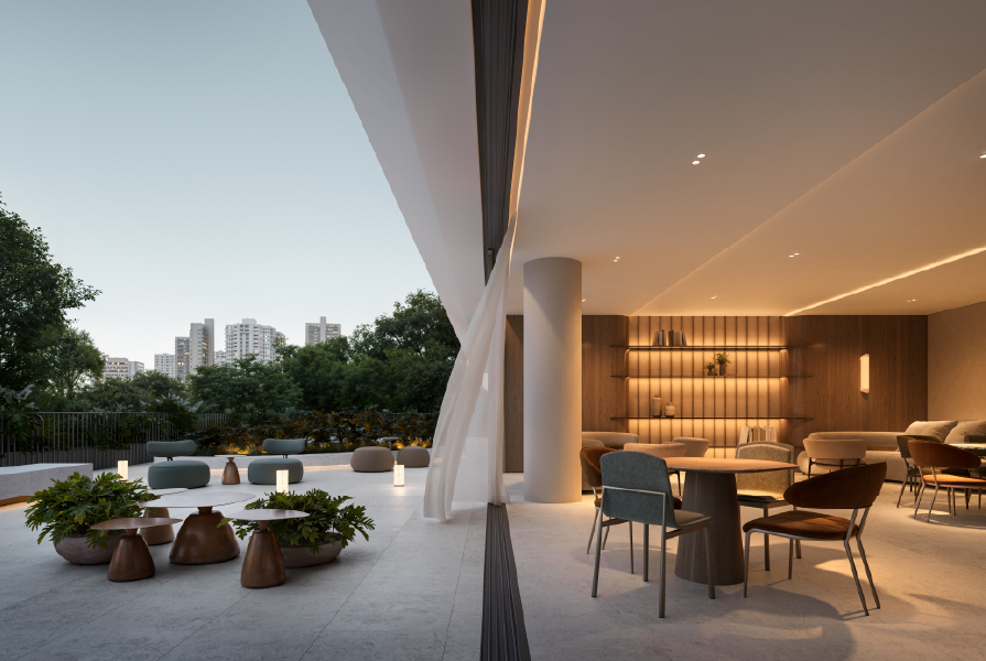 A paleta de cores claras, aliada a uma praça convidativa ao redor do edifício, reforça o diálogo com o entorno verde e com quem circula pelas ruas. As varandas amplas e generosas juntamente com a transição entre interior e exterior, integrando floreiras à vegetação exuberante do parque. Na fachada, o gradil contribui para a ventilação constante, a entrada de luz natural e a sensação de leveza nos espaços internos.