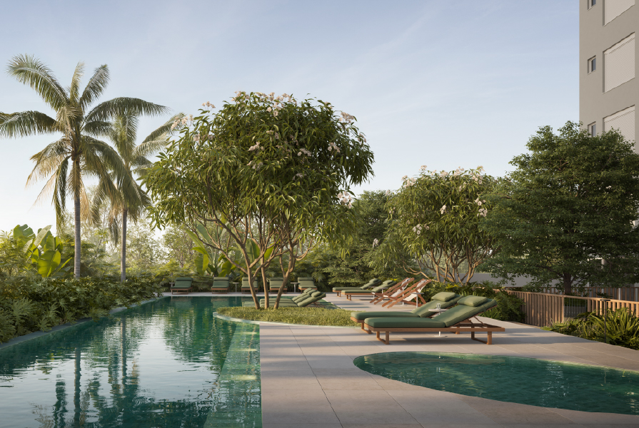 Nas áreas comuns, a vegetação ocupa papel central, criando jardins e até um quintal urbano, um convite à convivência e à desconexão das telas. A piscina, com formato oval e tons de verde inspirados na vitória-régia, reforça a integração com a natureza. À noite, devido a iluminação indireta a sensação de aconchego e acolhimento é ampliada.