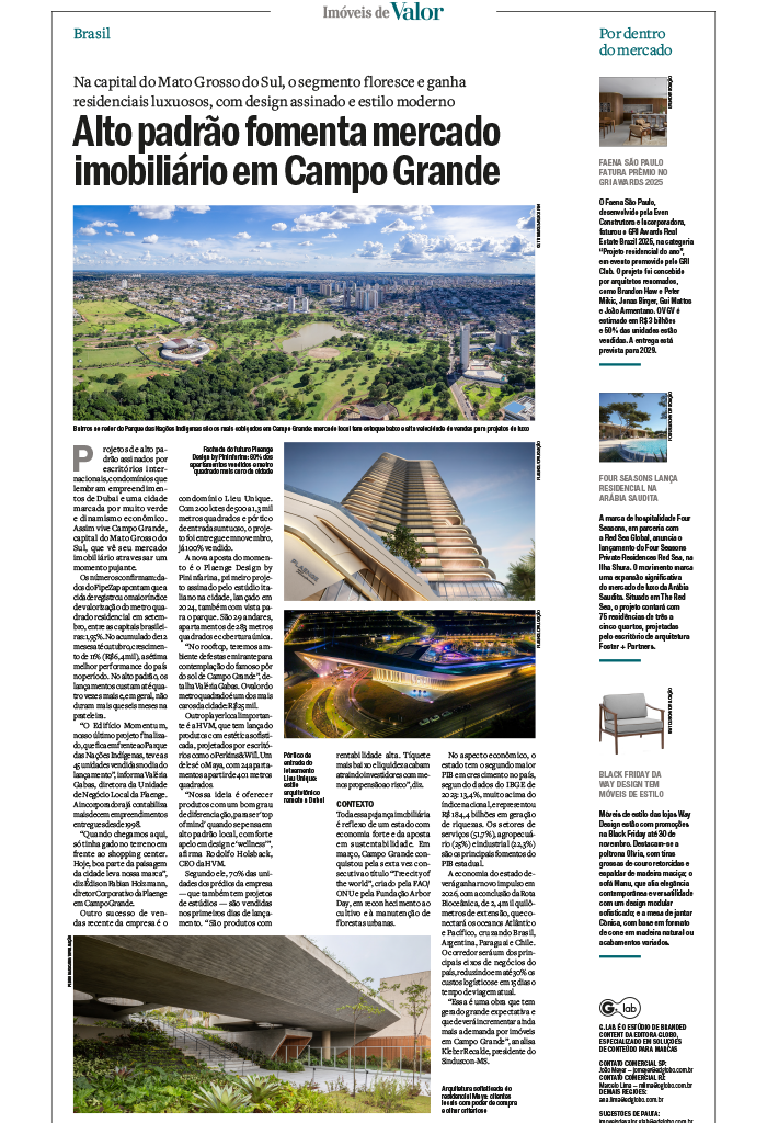 Construir em Campo Grande significa interpretar a cidade em movimento, traduzir suas transformações e criar propostas que dialogam com novos modos de viver. Foi com essa visão que desenvolvemos o Momentum, o Plaenge Design by Pininfarina e o Lieu Unique. Vê-los agora no especial Imóveis de Valor, do Valor Econômico, reforça a relevância dessa abordagem e reconhece o trabalho contínuo das equipes envolvidas.
